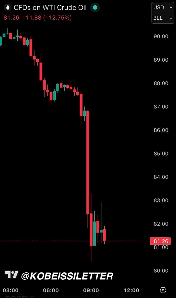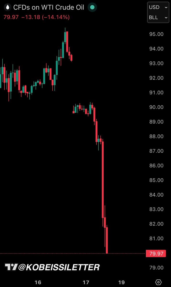 U.S. oil prices officially fell below $80 per barrel, a 32% decline over nine consecutive trading days following Iran's declaration that the Strait of Hormuz is fully open for commercial shipping. A massive $760 million bet predicting a fall in oil prices was placed via options on the USO ETF just minutes before President Trump announced the strait was open, raising questions about potential insider information.