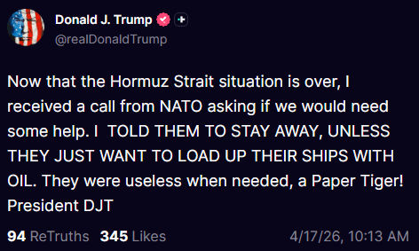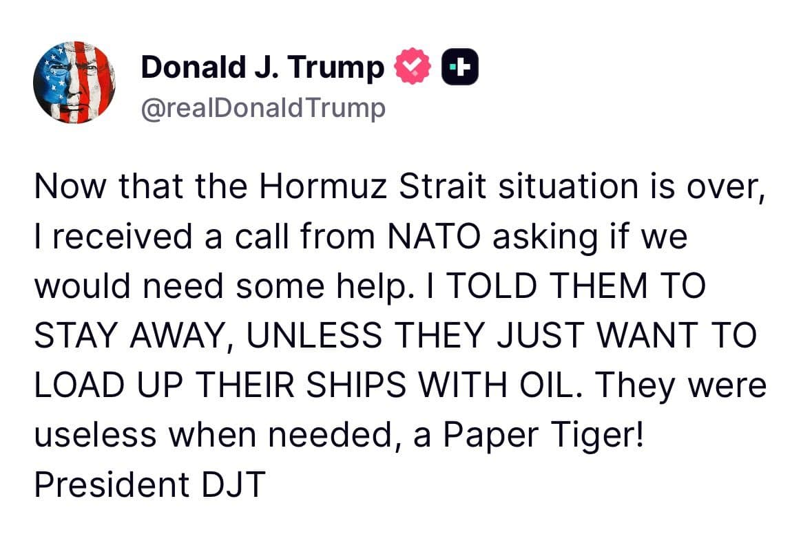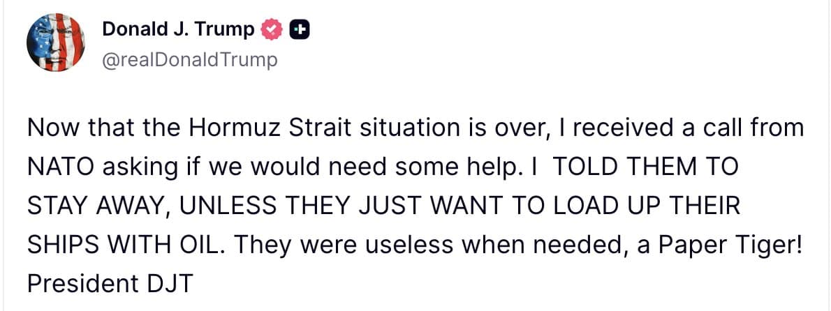 President Donald Trump publicly dismissed NATO as a 'paper tiger' and rebuffed its offer of assistance in the Strait of Hormuz, telling the alliance to 'stay away.' This continued pattern of distancing from traditional allies was juxtaposed with his public gratitude towards Gulf states and Iran, whom he thanked in a series of social media posts. Concurrently, he announced a U.S. naval blockade of Iran, framing it as a necessary action to prevent Iran from 'getting rich.'