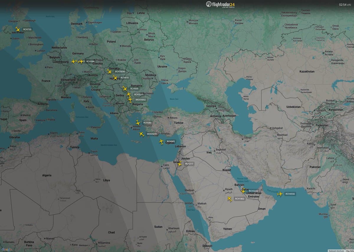 Militarily, the United States is continuing a significant airlift operation to the Middle East. U.S. Air Force C-17A Globemaster III heavy transport aircraft flights into bases in the United Arab Emirates and Qatar continued at full capacity overnight via Germany, indicating a major, ongoing logistical buildup.