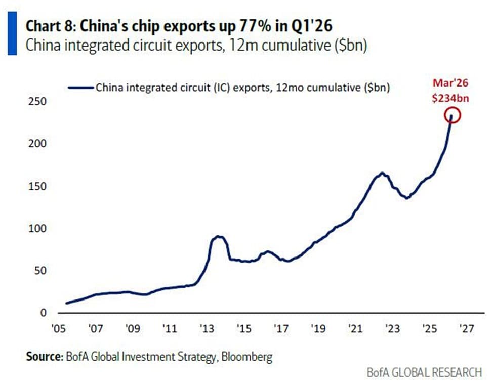 Economically, Chinese commercial satellites have become a key source of Earth observation imagery for Iran following U.S. restrictions, filling a void created by the Trump administration's policies. Taiwan's stock market capitalization surged to $4.14 trillion, surpassing the UK's for the first time, driven by an AI-fueled semiconductor sector. China's integrated circuit exports surged 43% year-over-year to a record $234 billion over the last 12 months, with 77% growth in Q1 2026. German EV sales in China plummeted 55.6% in Q1 2026, with market share falling to a record low of 1.6%.