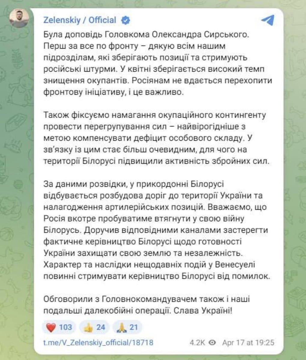 Ukrainian President Volodymyr Zelensky announced that Ukraine plans to produce its own air defense systems as a serious strategic objective. The commander of Ukraine's unmanned systems announced a systematic effort to move UAV pilots to remote operations to minimize losses among highly qualified specialists. A U.S. Army Bombardier Artemis II aircraft conducted an intelligence, surveillance, and reconnaissance mission over the Black Sea, part of ongoing U.S. military support.