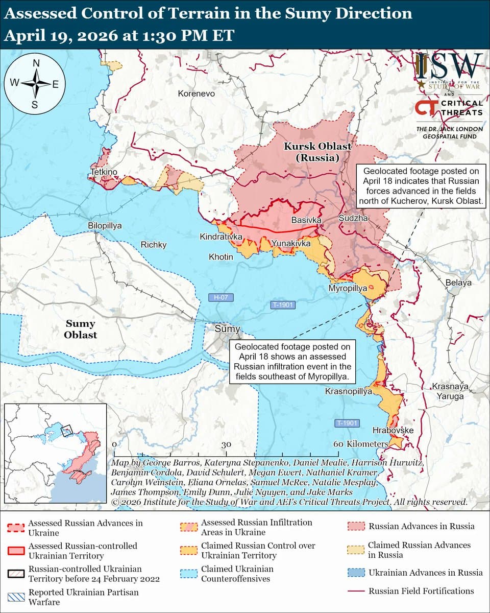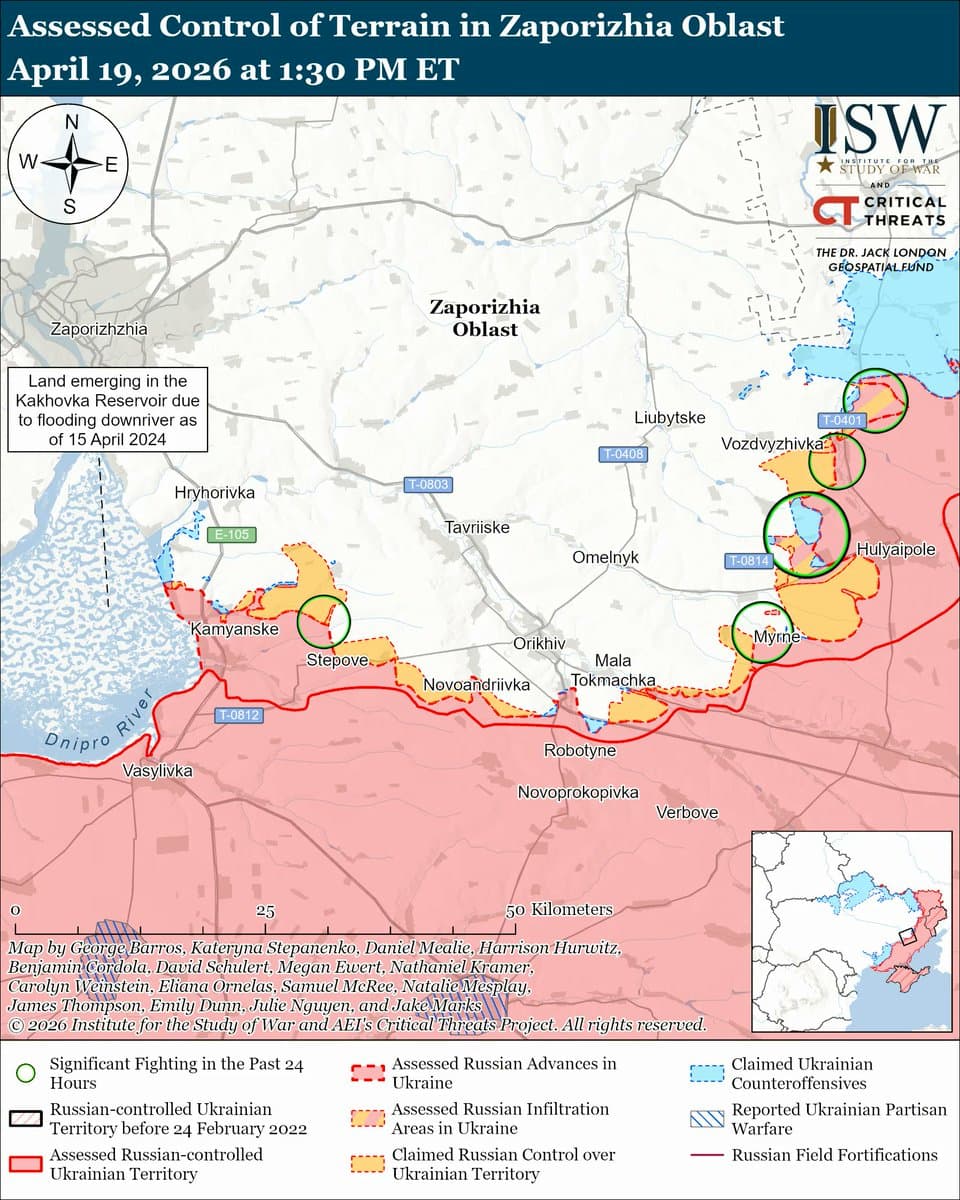 Ukrainian forces reported counterattacks and advances in other areas. In the Novopavlivka and Prosyana directions, Ukrainian forces recaptured positions in Novopavlivka, while Russian forces broke through Ukrainian defences east of Oleksandrohrad. The net territorial change was approximately 8.73 square kilometers gained by Ukraine and 1.26 square kilometers gained by Russia. Intense, seesaw fighting continued in the Vovchansk sector, with both sides making localized advances; Russian forces crossed the Vovcha River into parts of Okhrimivka, where Ukrainian counterattacks are underway.