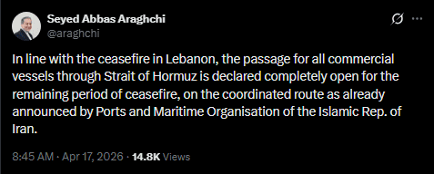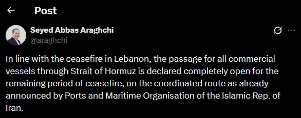 The status of the Strait of Hormuz remains the central point of contention between the United States and Iran, with a series of contradictory public statements defining the last 24 hours. Iranian Foreign Minister Seyed Abbas Araghchi declared the strait 'completely open' for commercial navigation, explicitly linking this opening to the Lebanon ceasefire and the remaining period of the U.S.-Iran ceasefire. Iran's conditions, detailed by the IRGC Navy's 'New Order,' mandate that all civilian vessels use a designated maritime corridor, coordinate passage with Iranian forces, and prohibit military ships and any vessels or cargo linked to hostile states like the U.S. or Israel.