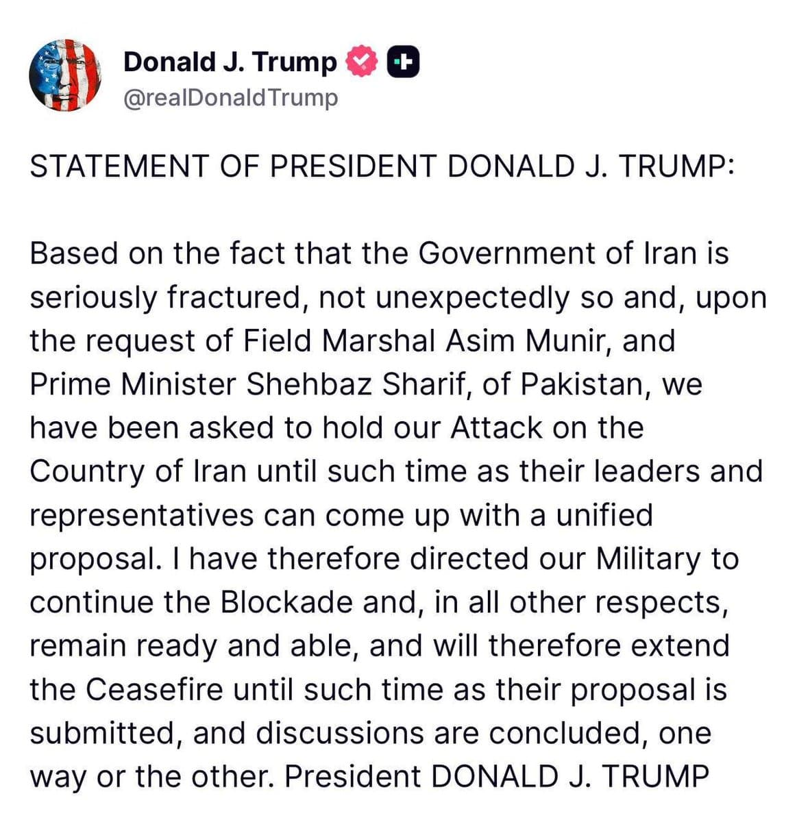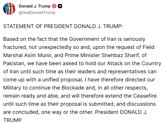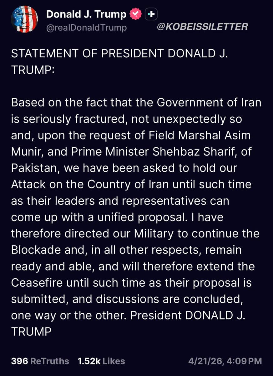 The US-Iran ceasefire officially expired overnight, with no Iranian agreement to an extension. President Trump announced the US is holding its planned attack on Iran at the request of Pakistani officials, citing a 'seriously fractured' Iranian government. Treasury Secretary Bessent confirmed the ceasefire extension amid continued economic pressure, including a naval blockade costing Iran an estimated $400 million daily. However, Iran formally refused to participate in the planned Islamabad talks, calling the decision final. Vice President Vance's diplomatic trip to Pakistan was canceled accordingly.