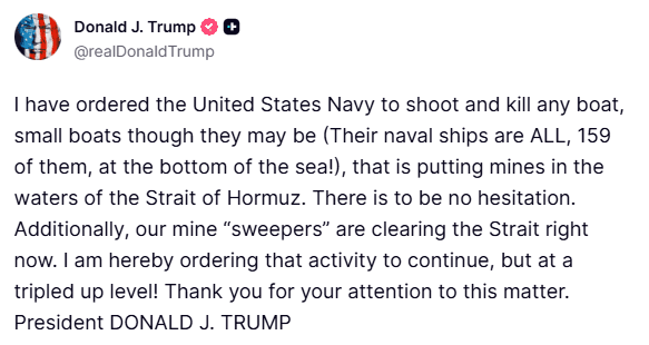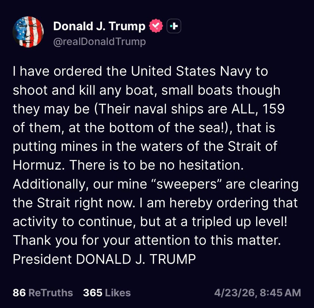 The strategic Strait of Hormuz remained a focal point of intense confrontation. Iran planted new naval mines in the strait, causing a sharp collapse in shipping traffic. Concurrently, Iran announced it had deposited revenue collected from tolls on ships transiting the waterway into its central bank for the first time, asserting its effort to control the chokepoint. In response, President Donald Trump declared the US Navy has total control over the strait and reinforced an order for the US Navy to shoot and kill any Iranian naval unit involved in mining activities.