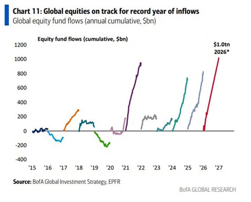 Global equity funds are set to attract over $1 trillion in annual inflows for the first time in 2026.