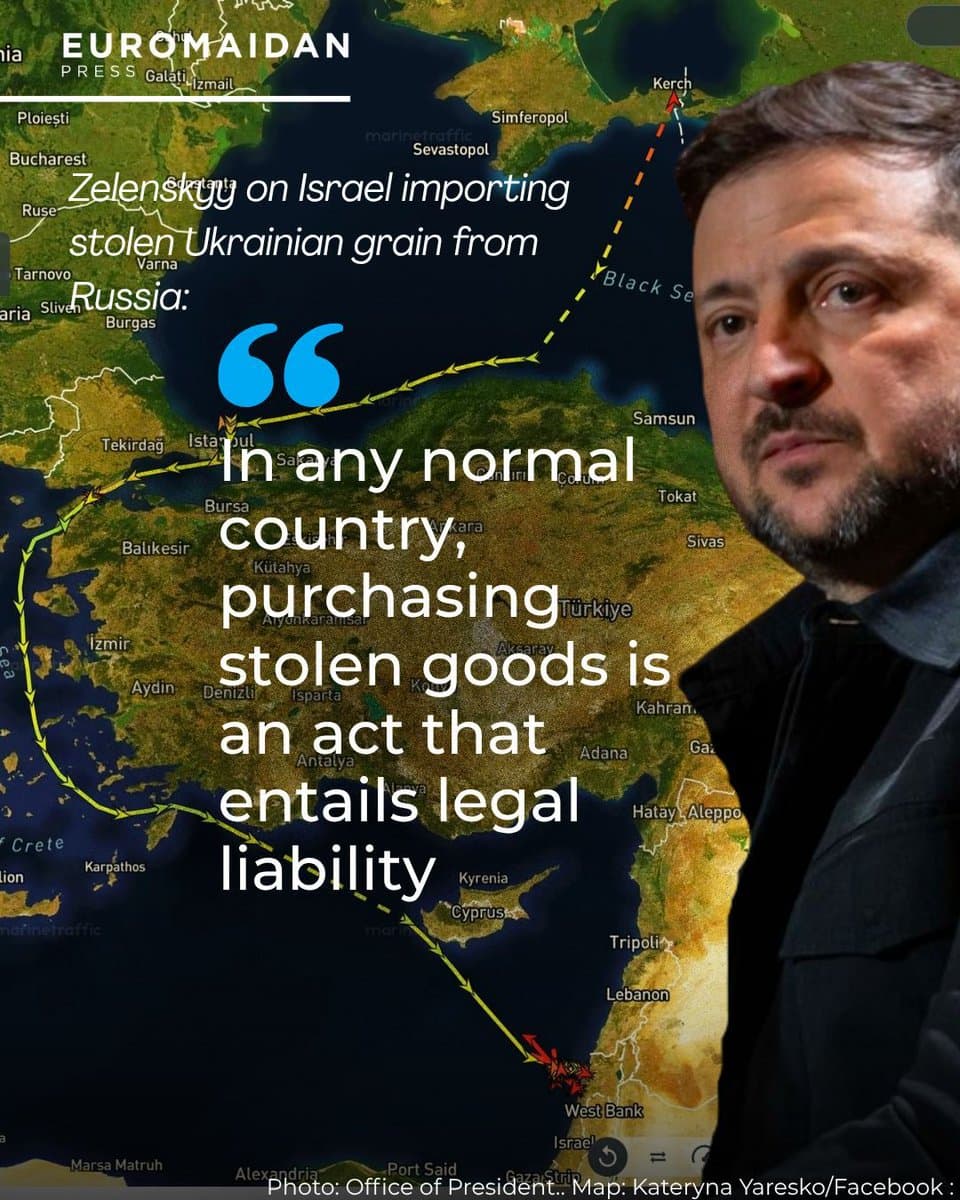 Zelensky warns Israel that buying stolen Ukrainian grain is a crime and announces sanctions.
