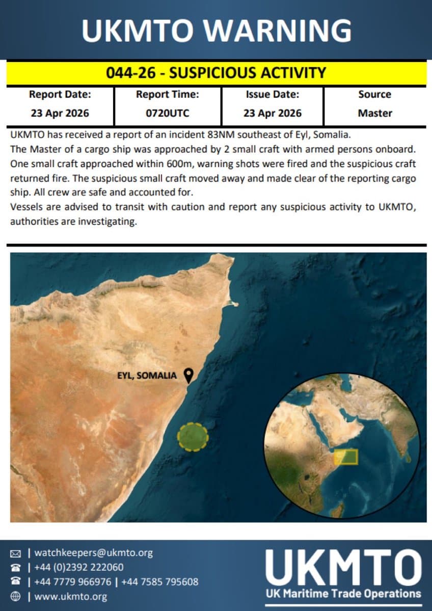 Suspected pirates fired on a cargo ship after being warned off with shots by the crew in an incident southeast of Eyl, Somalia.