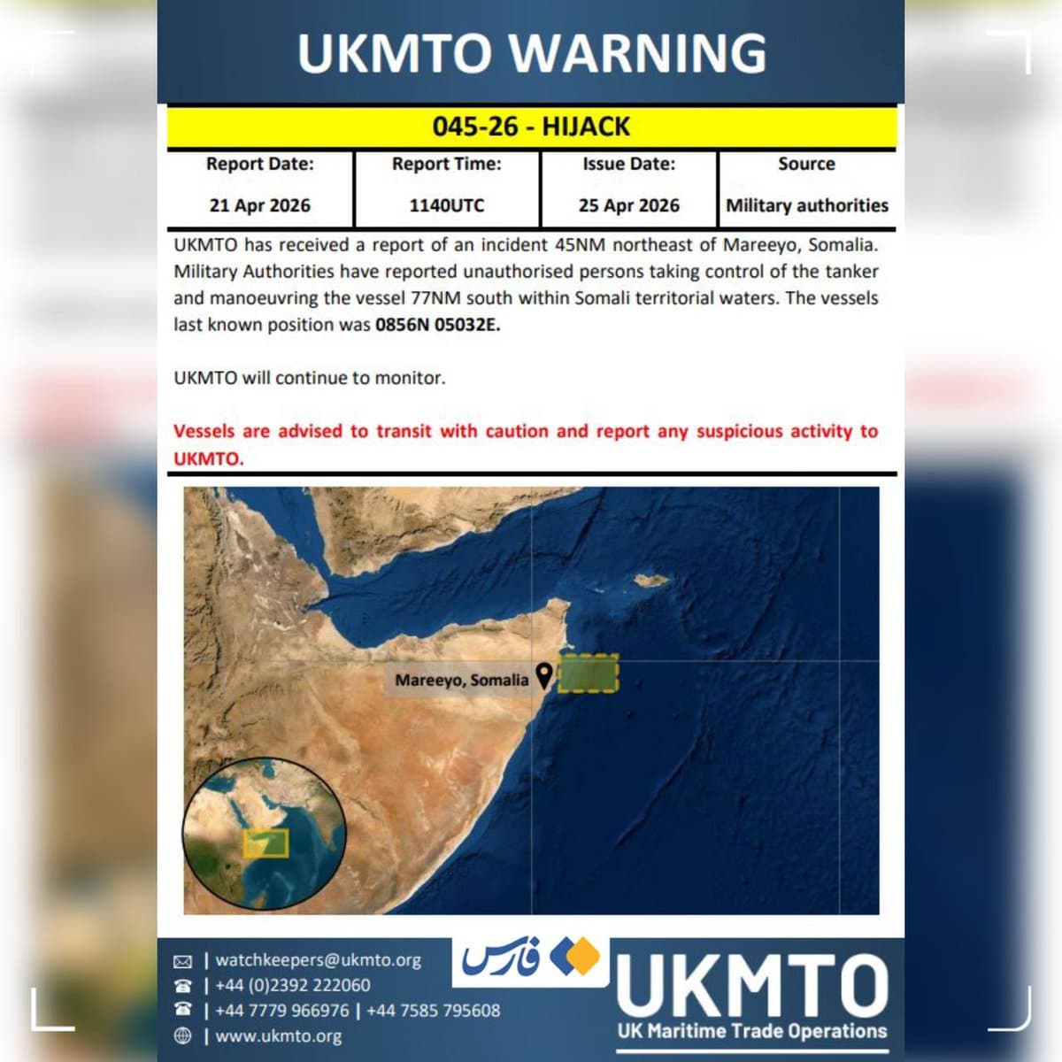 UKMTO reports another tanker hijacking northeast of Mareeyo, Somalia.