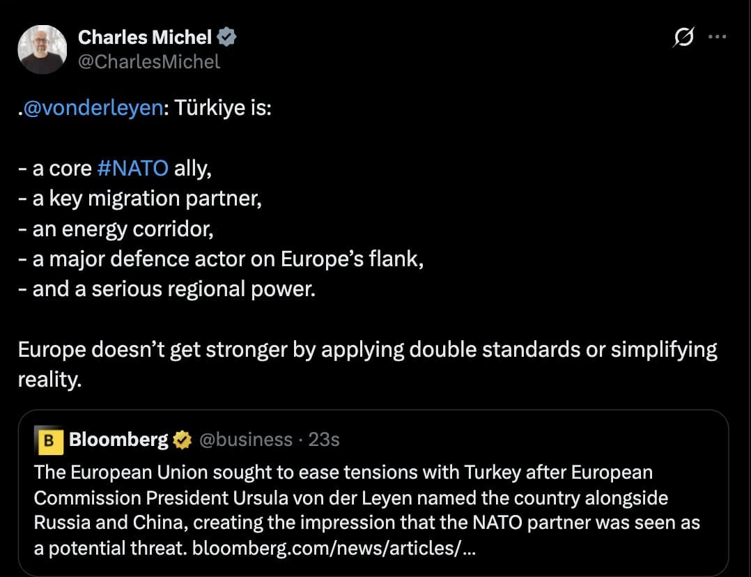 Former European Council chief Charles Michel publicly countered Ursula von der Leyen for grouping Turkey with Russia and China.