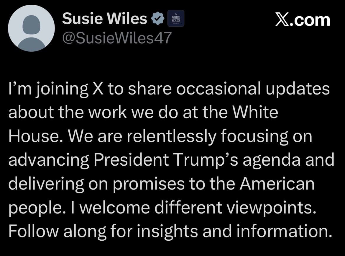 White House Chief of Staff Susie Wiles has created an X account to share updates about White House work.