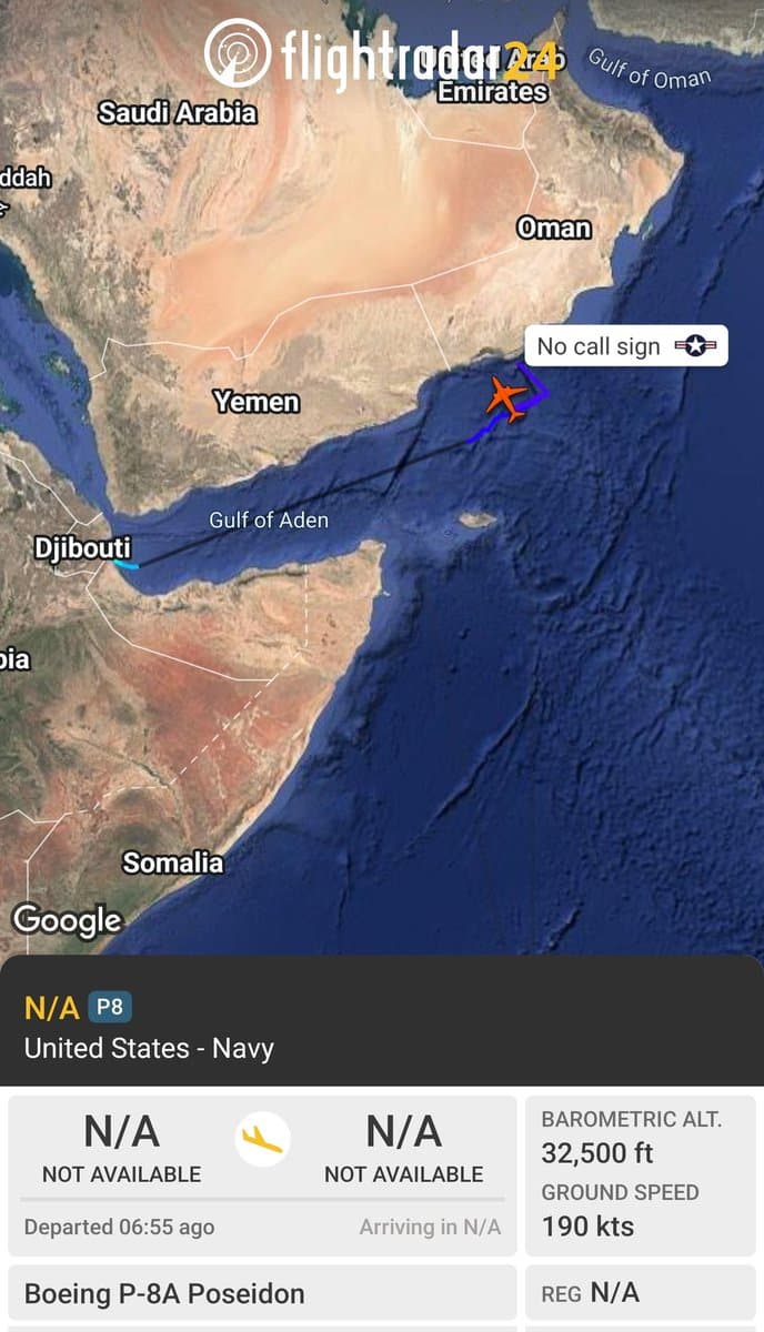 A US Navy P-8A Poseidon maritime patrol aircraft is operating over the Arabian Sea off the coast of Taqah, Yemen.
