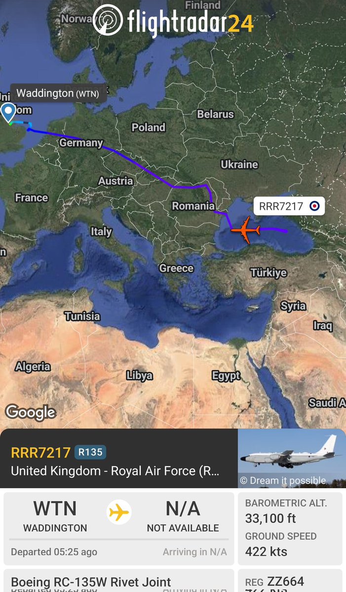 A UK RC-135W Rivet Joint aircraft has been deployed from RAF Waddington on a surveillance mission over the Black Sea.