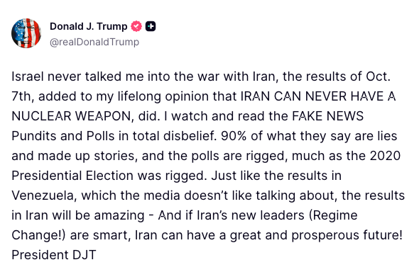 Trump elaborated on his denial in a Truth Social post, specifically mentioning October 7 attacks and his opposition to Iranian nuclear weapons as factors, while attacking media and polls as rigged.