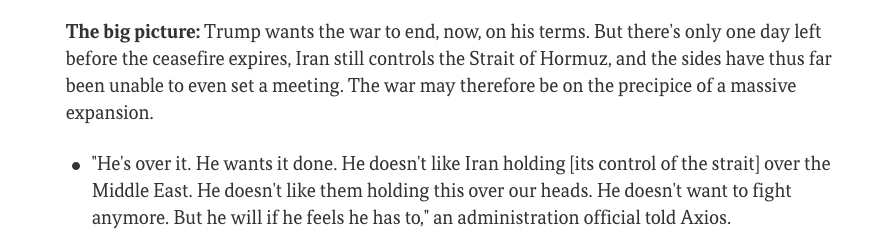 The Axios report provides direct quotes from the administration official, including Trump's frustration with Iran's leverage over the Strait of Hormuz and his willingness to fight if necessary.