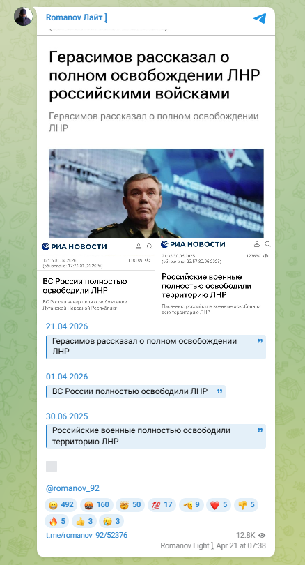 A prominent Russian military blogger has mocked repeated official claims by General Valery Gerasimov about the full liberation of Ukraine's Luhansk region.