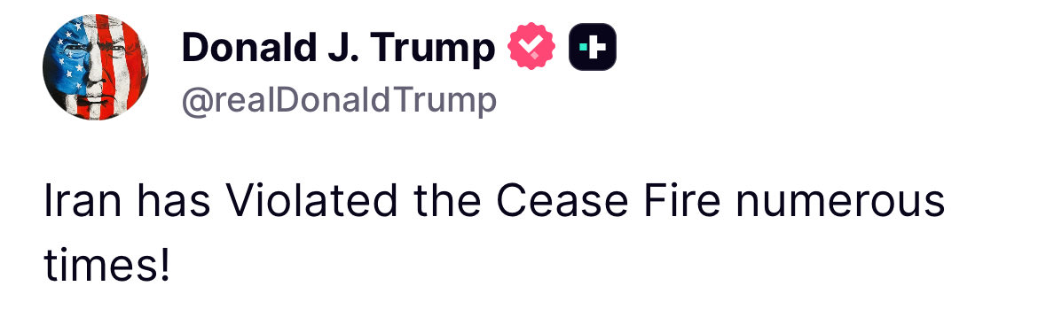 President Trump: Iran has Violated the Cease Fire numerous times! https://t.co/OYFbpj9WIr