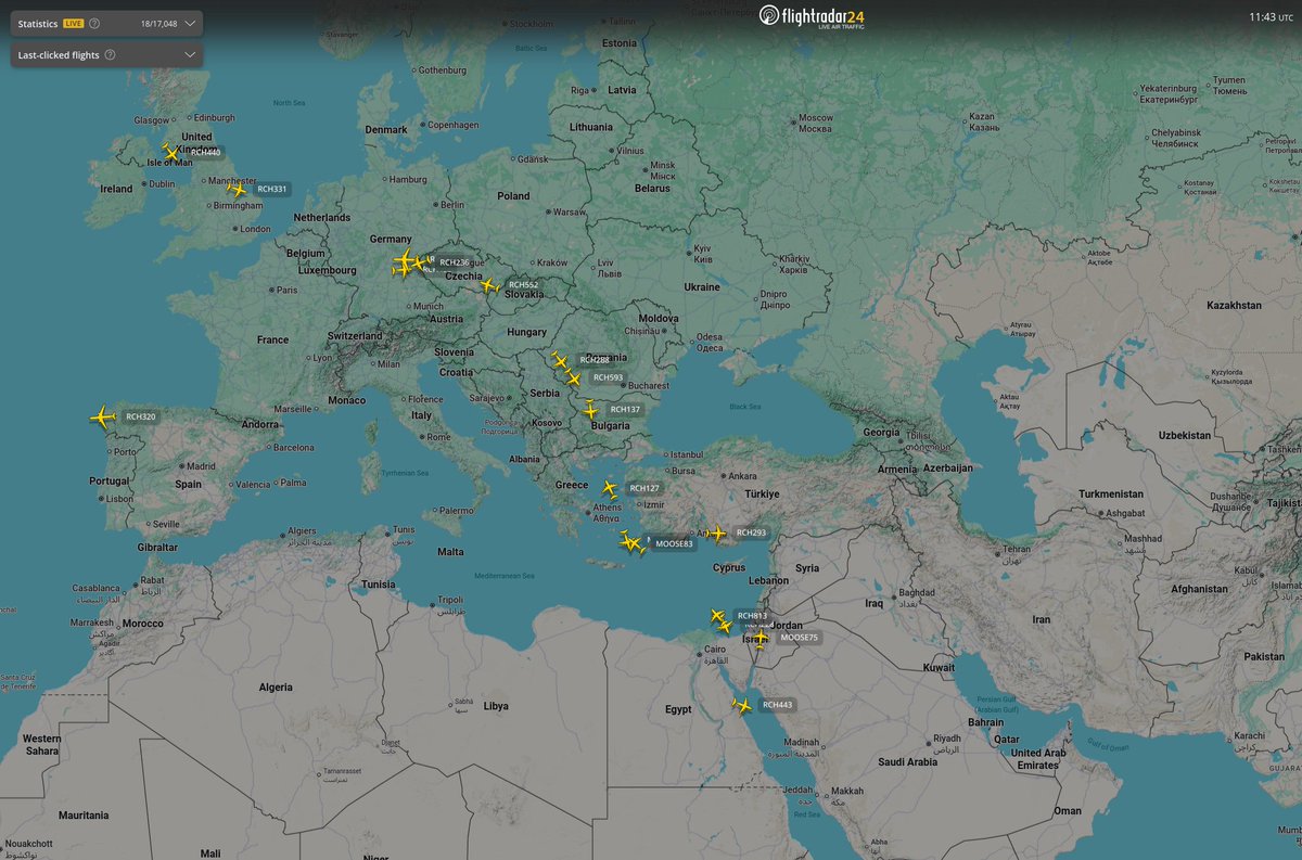 The U.S. Air Force air bridge over Europe and into the Middle East continues with at least 16 C-17A "Globemaster IIIs" j.