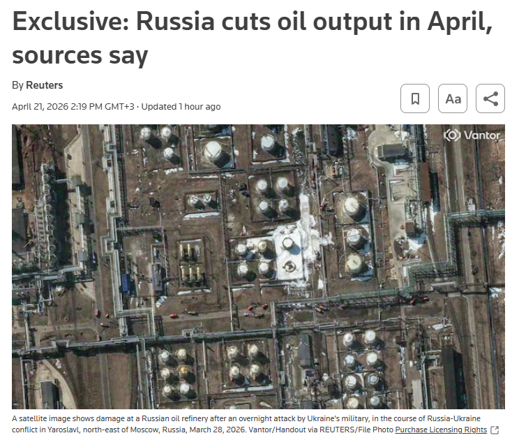 Russia likely cut oil production in April by about 300,000–400,000 barrels per d...