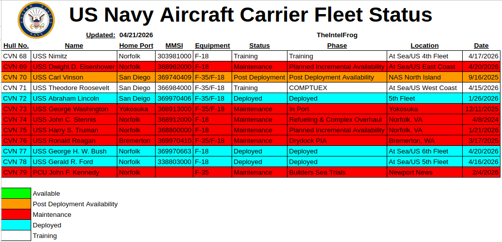 US Navy Aircraft Carrier Fleet Status Update: Deployed: -USS George H.W. Bush (...