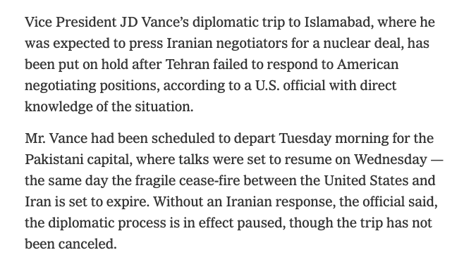 The New York Times reports Vance's trip could resume at short notice, contingent on Iran responding in a way President Trump deems acceptable.