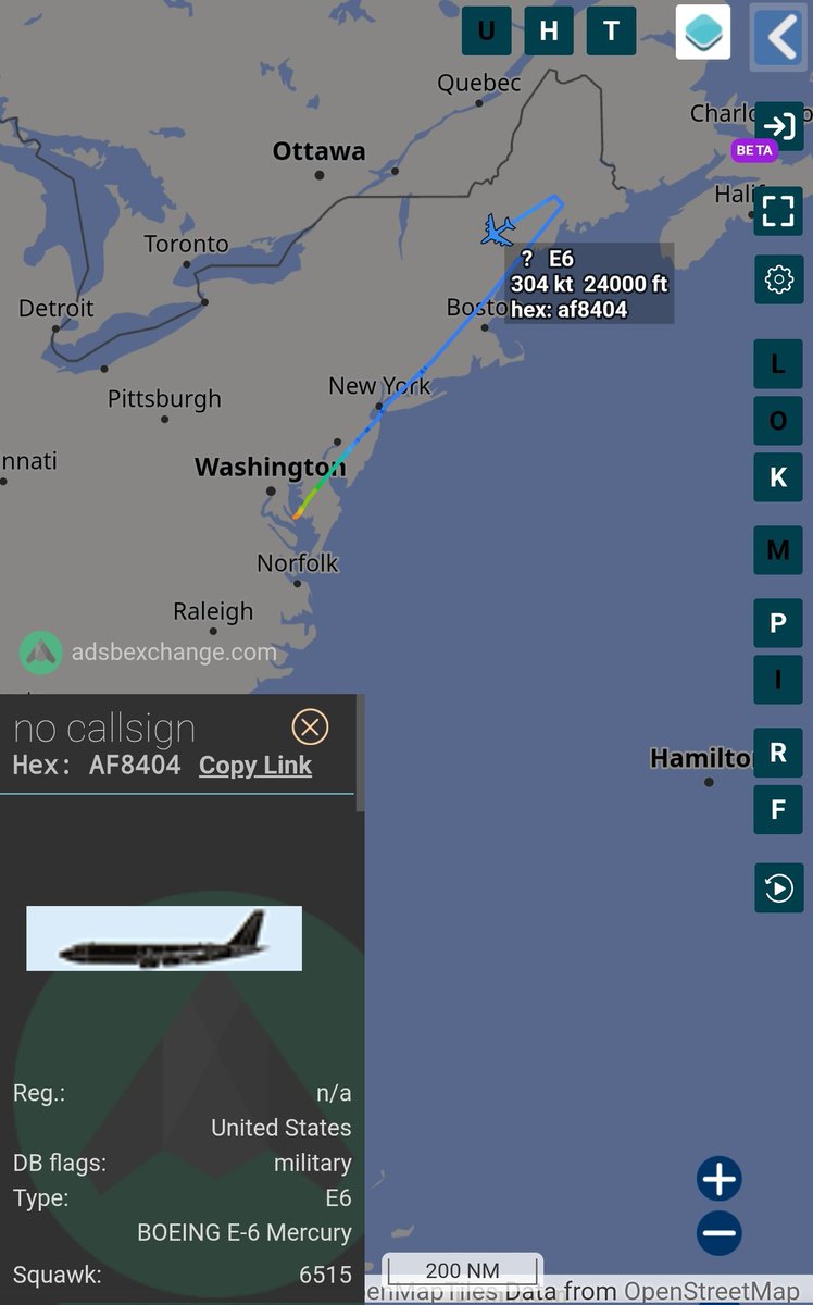 An E-6B Mercury airborne command post was tracked operating from Patuxent River, Maryland.