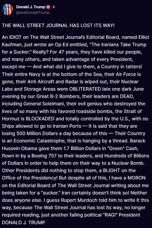 The latest post specifically targets a Wall Street Journal op-ed on his Iran policy.