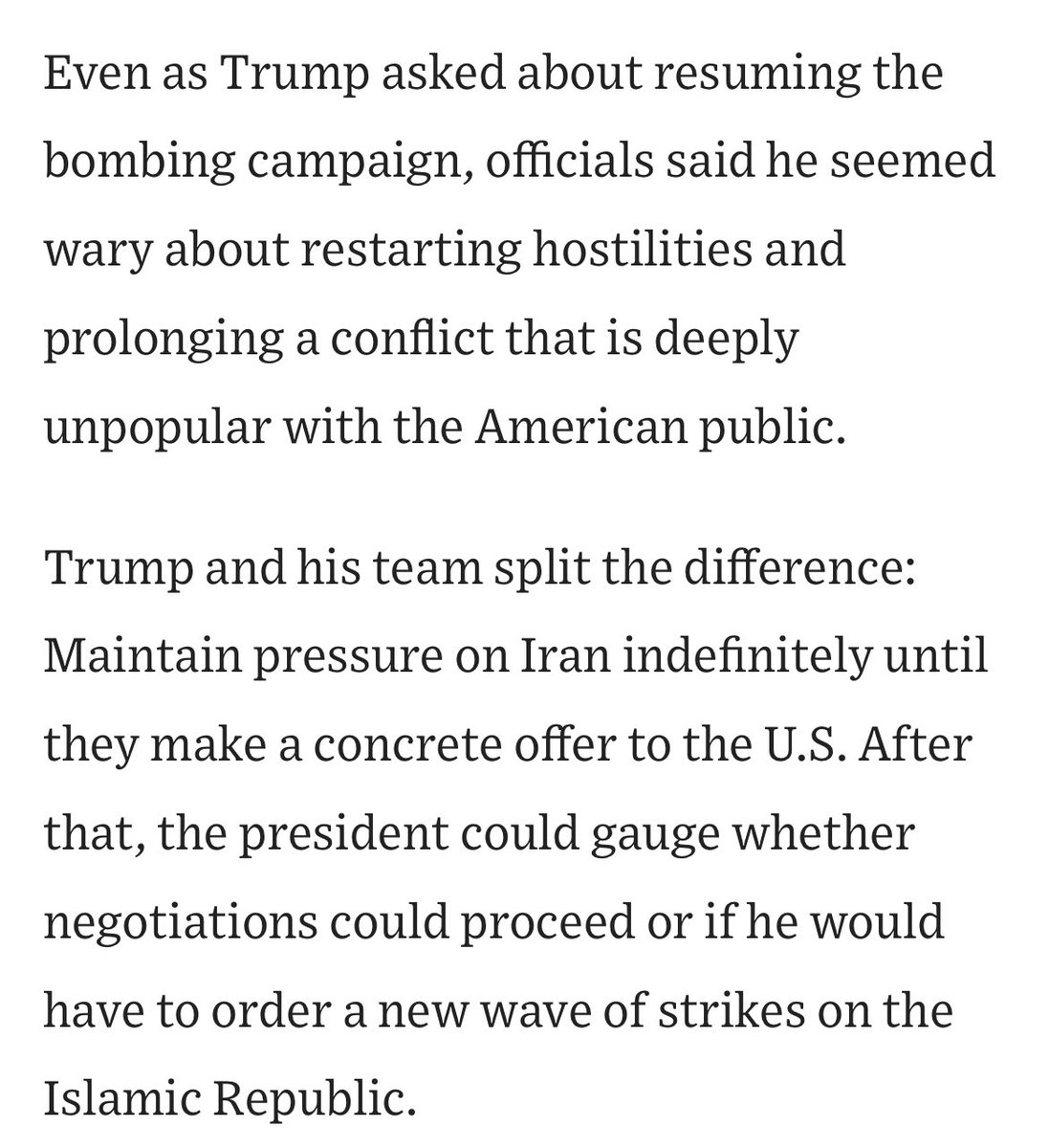 President Trump considered resuming strikes on Iran but opted for continued pressure to force a serious proposal, fearing escalation.