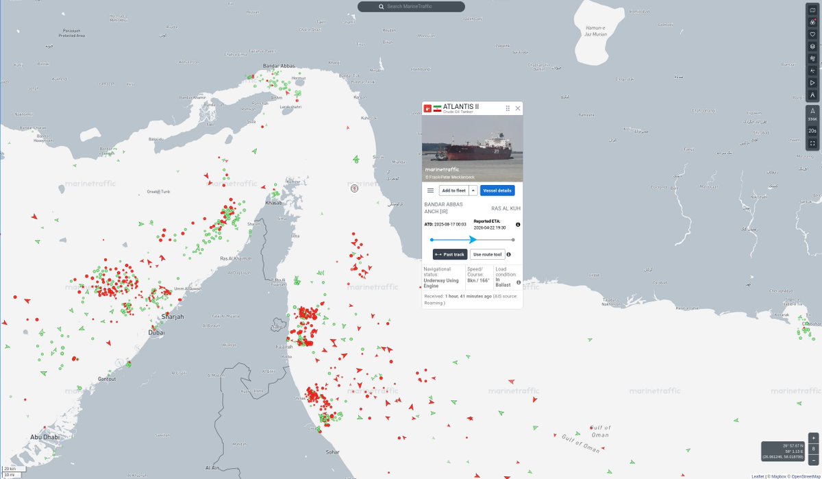 The Iranian-flagged crude oil tanker Atlantis II is transiting the Strait of Hormuz and heading toward the US naval blockade at the entrance to the Arabian Sea.
