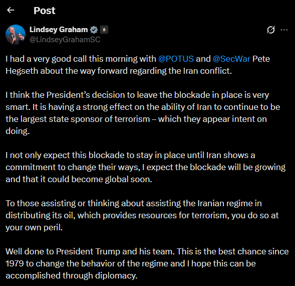 Graham now states the blockade on Iran could soon become global, expanding on his previous endorsement.