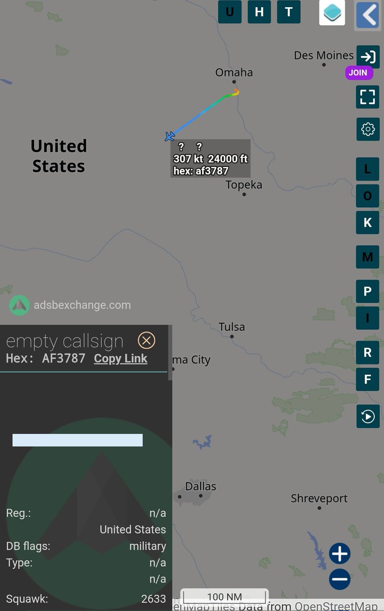 A US Navy E-6B Mercury TACAMO aircraft, using a tactical hex code, has been tracked departing from Offutt Air Force Base.