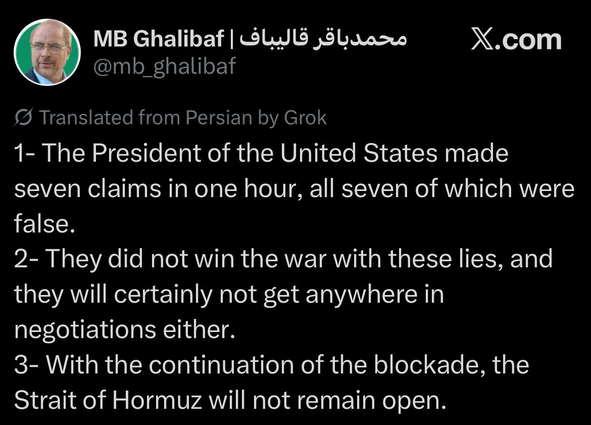 Iran's Parliament Speaker states a ceasefire in Lebanon, based on the April 8 understanding, was implemented last night.