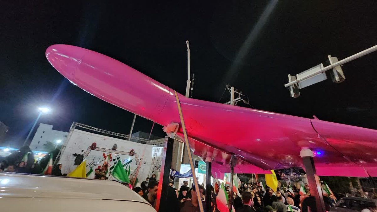 A pink-painted Shahed-136 drone has been publicly displayed on the streets of Ahvaz, Iran, drawing civilian crowds.