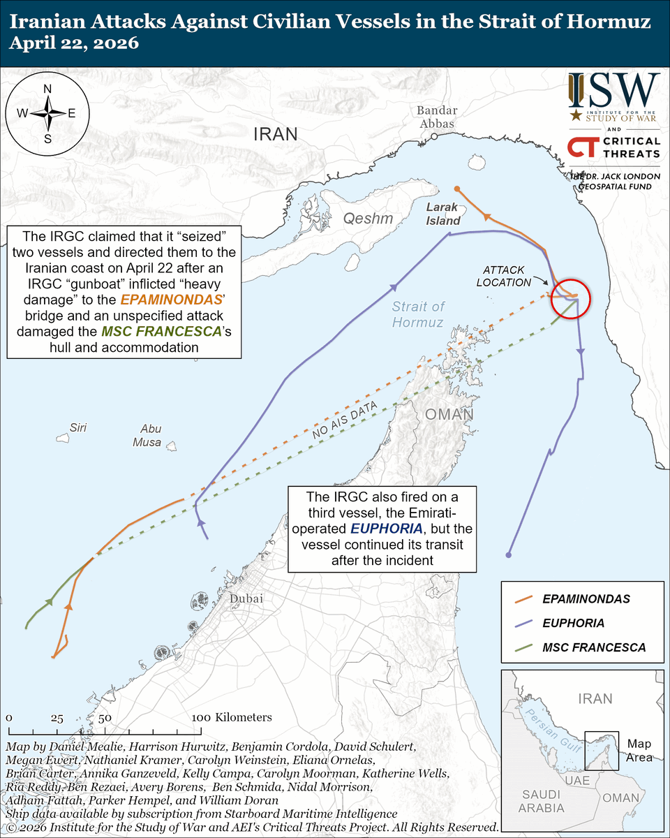Iran's IRGC Navy attacked and likely redirected two vessels toward Iran on April 22, likely to enforce sovereignty claims and disrupt shipping.