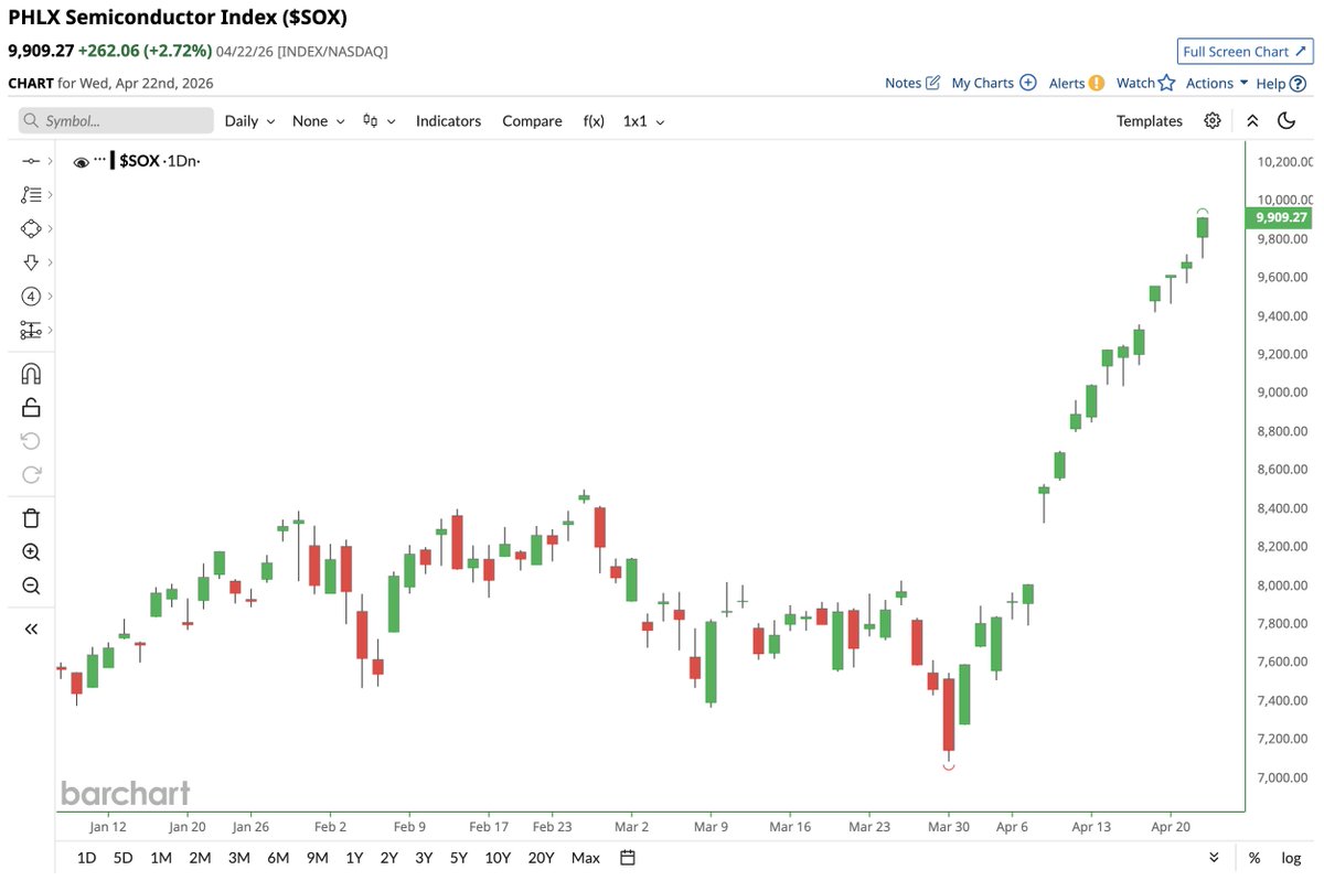 Semiconductor stocks have now traded green for 16 consecutive days, their longest winning streak in history.