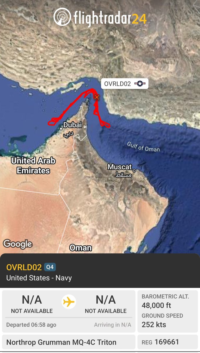 A US Navy MQ-4C Triton surveillance drone is currently operating over the Strait of Hormuz, monitoring the strategic waterway.