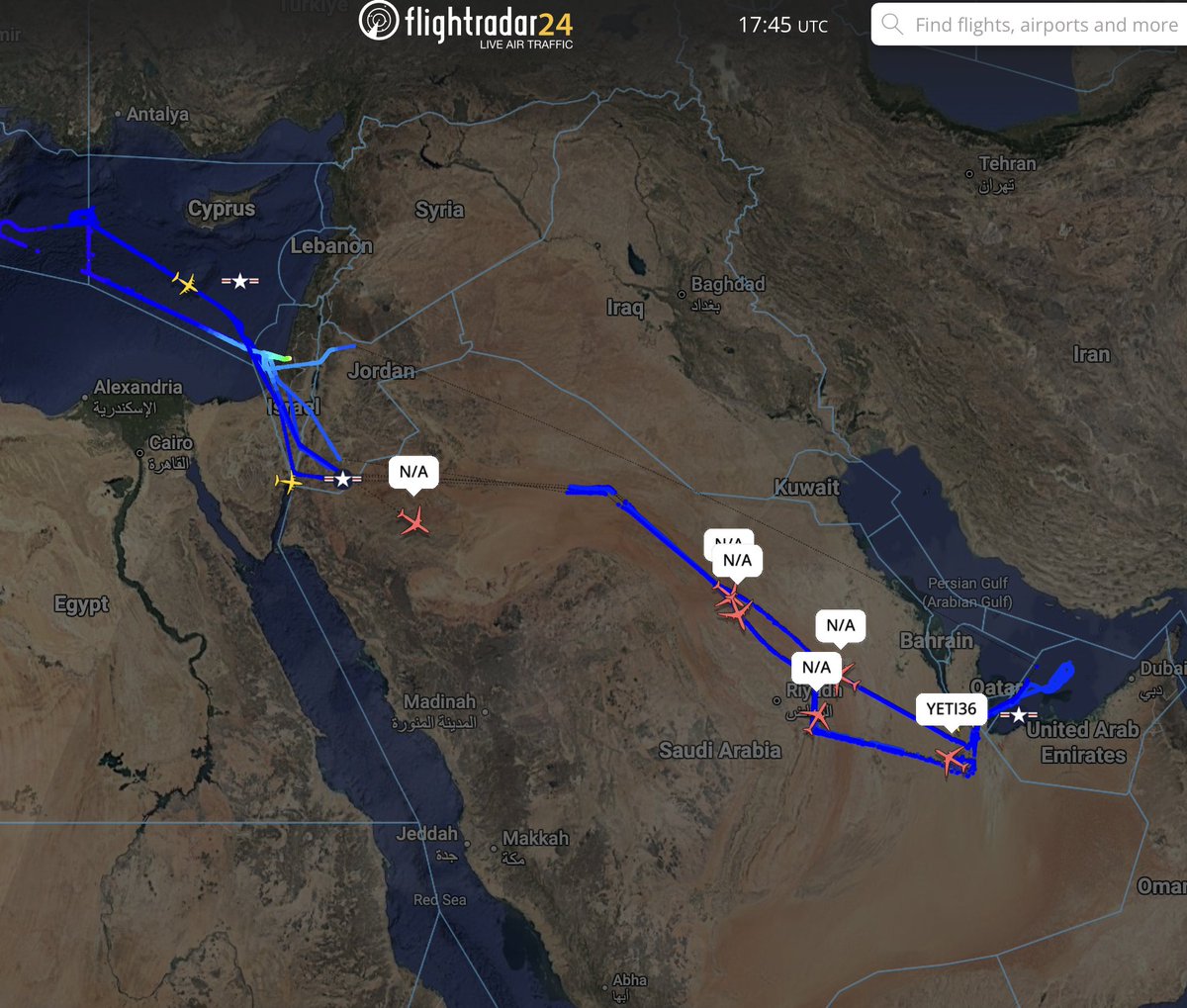 Six US Air Force tankers have been observed taking off from Tel Aviv and hovering near the Persian Gulf south of Iran.