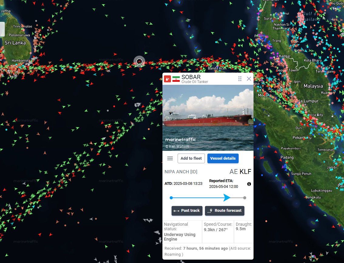 The Iranian-flagged crude oil tanker SOBAR has been tracked crossing the Malacca Strait and entering the Indian Ocean.