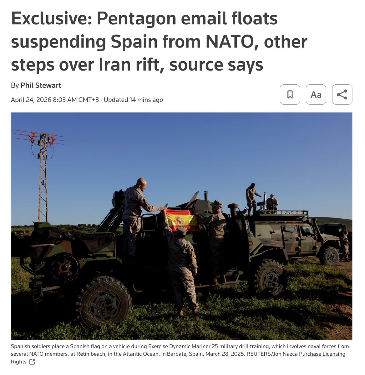 The US is reportedly assessing whether to suspend Spain from NATO as a punishment for its stance on the Iran war.