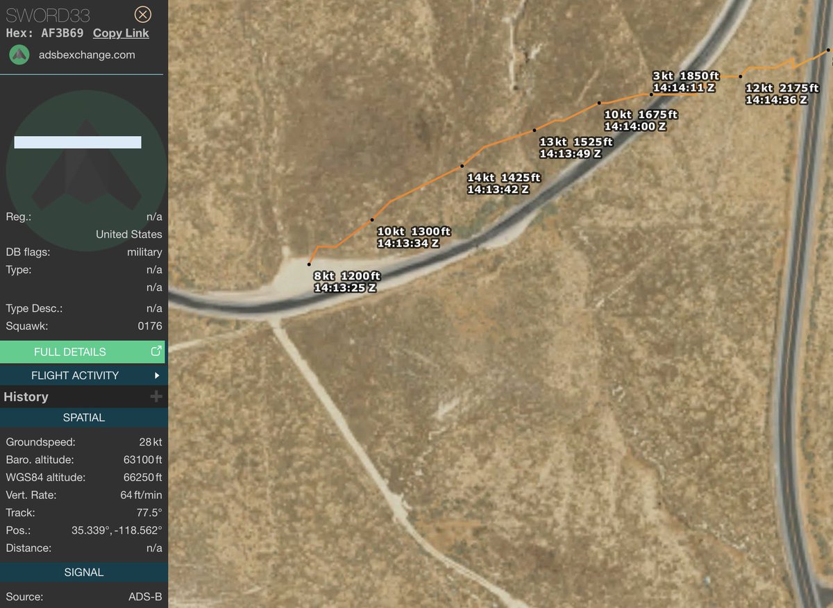 Two DARPA-operated aircraft, SWORD27 and SWORD33, were tracked on unusual flights, with one losing signal and the other descending into a restricted military area.