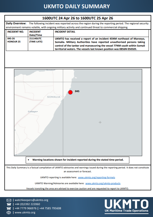 The UKMTO report confirms the pirates are steering the vessel toward Somalia's water-spaces.
