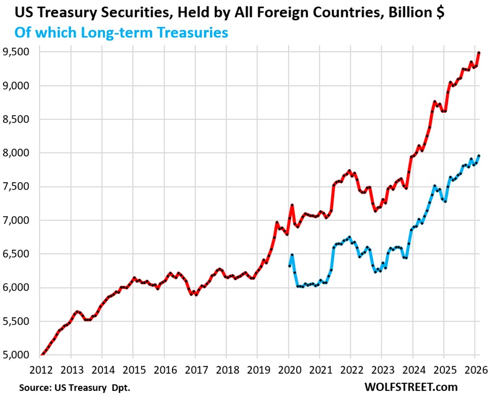 Foreign holdings of US Treasury securities surged by $200 billion in February to a record $9.49 trillion.
