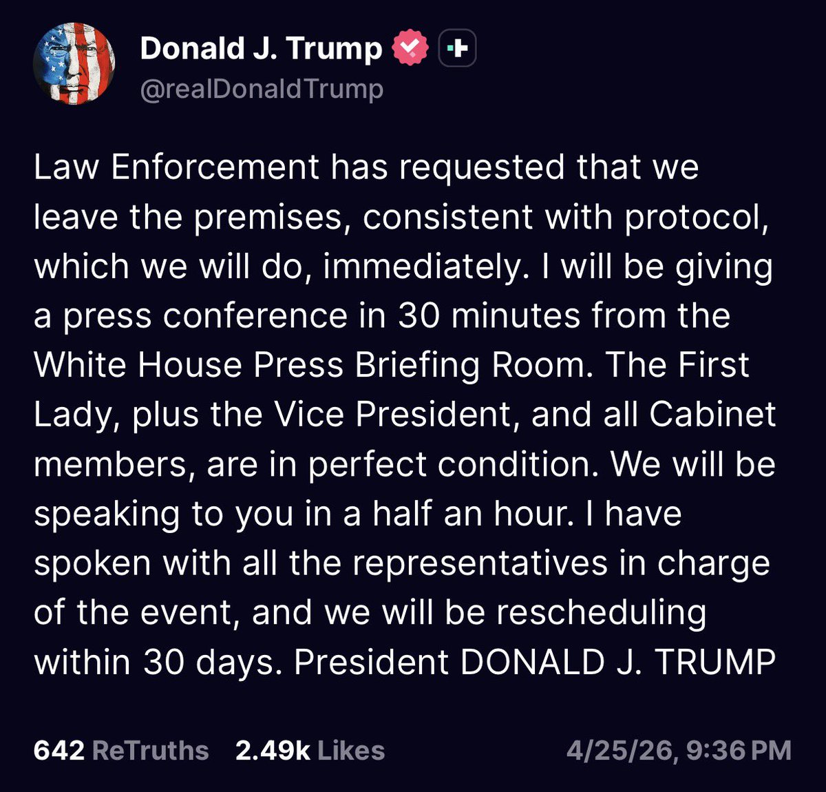 President Trump announced he will not return to the White House Correspondents' Dinner venue and will address the nation from a press conference.