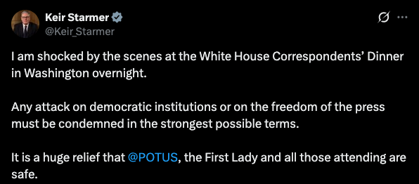 U.K. Prime Minister Starmer on shooting at White House Correspondents Dinner: I am shocked by the scenes at the White .