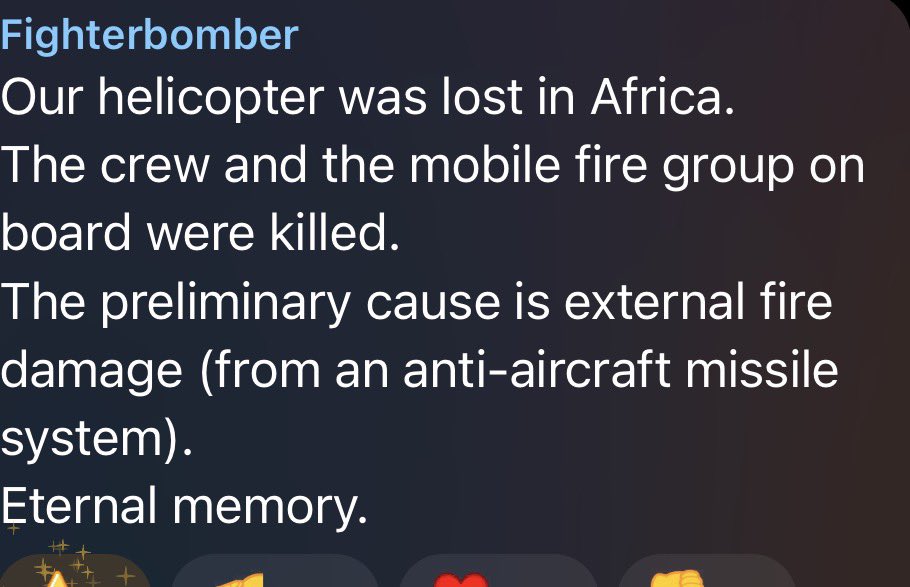 A Russian military helicopter was shot down during fighting in northern Mali, probably by rebel forces linked to JNIM. .