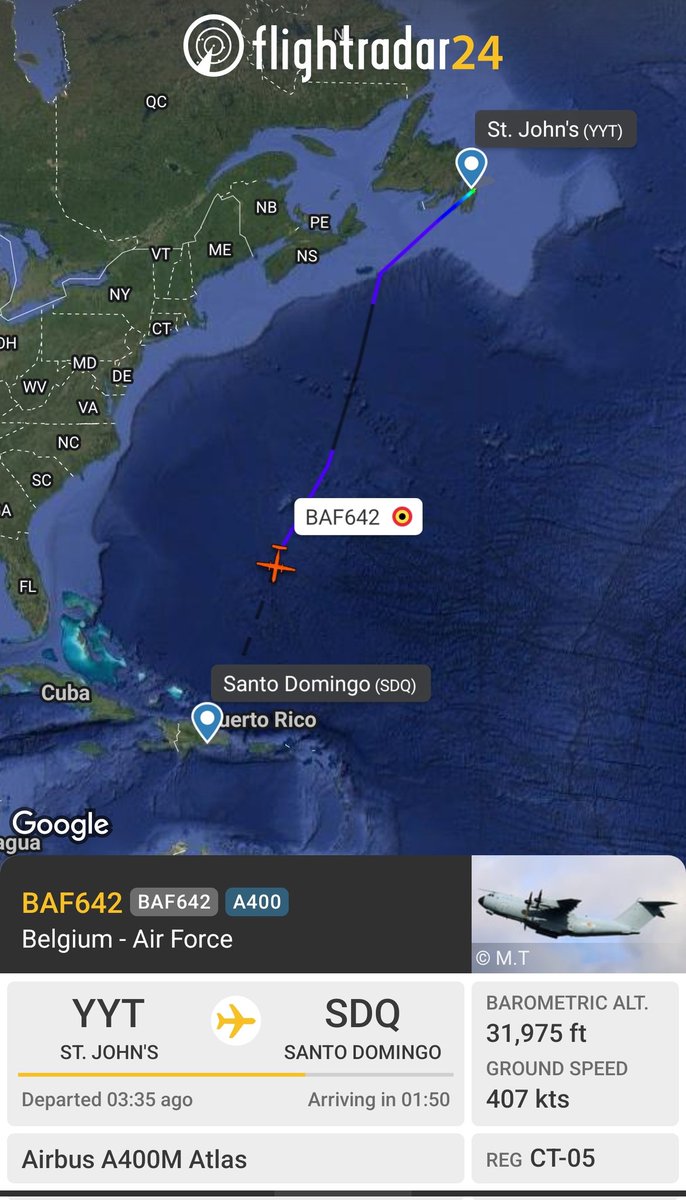 A Belgian Air Force A400M Atlas military transport aircraft has been tracked flying from Brussels to St. John's and then on to Santo Domingo in the Dominican Republic.