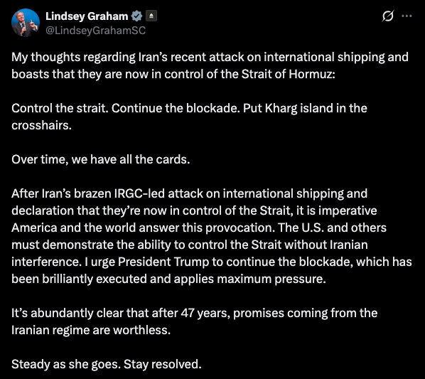 Senator Lindsey Graham says Iran's contradictory statements on Hormuz passage provide a lesson for US policy.