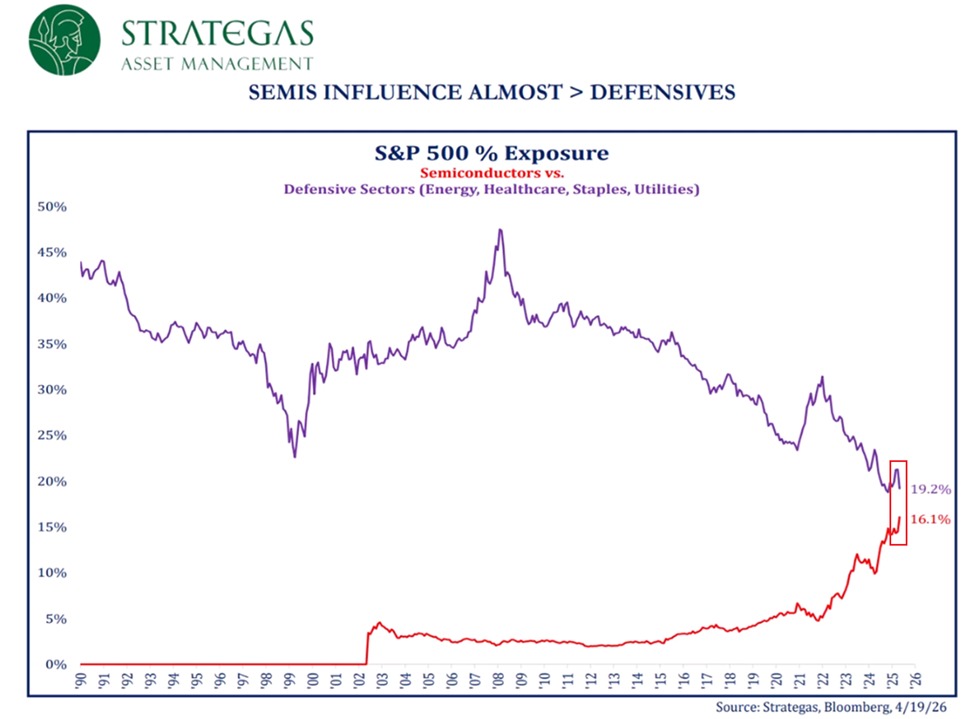 Semiconductor stocks now make up a record 16.1% of the S&P 500's total market capitalization.
